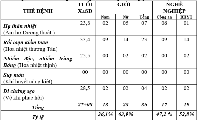 Nhận xét: Bệnh cảnh Khí huyết cùng kiệt không có mẫu nào chứng tỏ bệnh cảnh nhâph viện chủ yếu bệnh Bỏng vừa, ít Bỏng sâu và diện tích lớn. Tuổi trung bình X±SD = 27,8. Nam chiếm 36,1%, nữ chiếm 63,9%. Ngành Công an chiếm 47,2% và Bảo hiểm Y tế chiếm 52,8%. Những sự khác biệt này có ý nghĩa thống kê có lẽ là bệnh viện đặc thù của ngành công an (không có thiếu nhi).