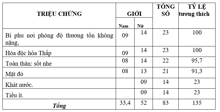 Nhận xét: Triệu chứng giai đoạn điều trị Bỏng mô tả trong các sách và lâm sàng chưa đủ tần số xuất hiện kết luận tương thích theo thống kê, có lẽ tương thích tính theo tỷ lệ % và cần mẫu lớn hơn kết luận. Thể bệnh Bỏng này nhập viện có lẽ theo tuyến chuyên khoa.