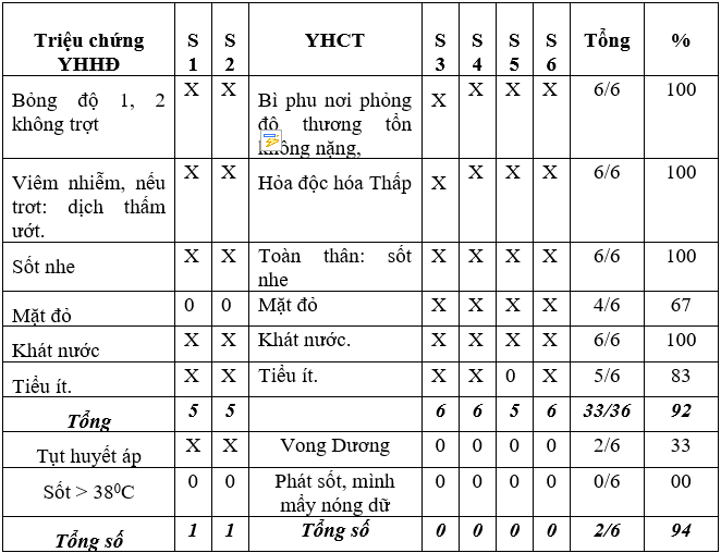 Results: Symptoms of Traditional Chinese Medicine at the hospital admission and the name of the disease form of traditional medicine did not have a statistically significant difference (p>0.05), but the scope of treatment of modern medicine in the surgical department is generally 3rd degree burns and burn area < 30%, at the Department of TCM, it is a 2nd degree burn without erosive lesions and burn area <10% has a statistically significant difference (p<0.05).