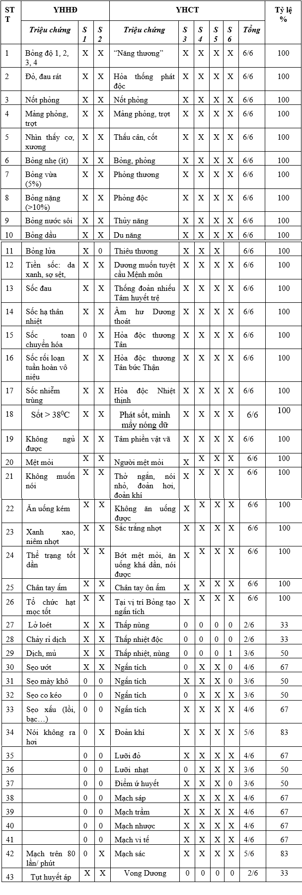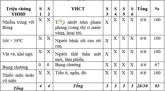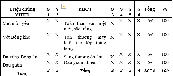 + Bước 2: Lập bảng tổng kết theo mục tiêu: triệu chứng vàng của Bỏng các triệu chứng tương thích giữ YHHĐ và YHCT.