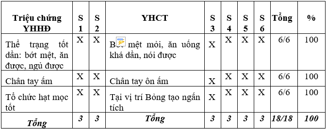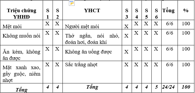 Lập bảng khảo sát tính tương thích của triệu chứng giữa YHHĐ và YHCT.