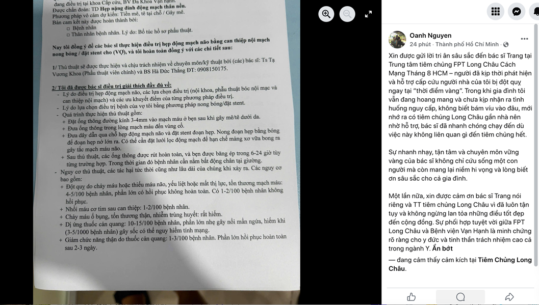 “Xin được gửi lời tri ân sâu sắc đến bác sĩ Trang tại Trung tâm tiêm chủng FPT Long Châu Cách Mạng Tháng 8 HCM – người đã kịp thời phát hiện và hỗ trợ cấp cứu người nhà em bị đột quỵ ngay tại “thời điểm vàng”. Trong khi gia đình em vẫn đang hoang mang và chưa kịp nhận ra tình huống nguy cấp, không biết bám víu vào đâu, mới nhớ ra có tiêm chủng Long Châu gần nhà nên nhờ hỗ trợ, bác sĩ đã nhanh chóng chạy đến việc này dù không liên quan gì đến tiêm chủng hết. Sự nhanh nhạy, tận tâm và chuyên môn vững vàng của bác sĩ không chỉ cứu sống một con người mà còn mang lại niềm hi vọng và lòng biết ơn sâu sắc cho cả gia đình. Một lần nữa, xin được cảm ơn bác sĩ Trang nói riêng và trung tâm tiêm chủng Long Châu vì đã luôn tận tụy và không ngừng lan tỏa những điều tốt đẹp đến cộng đồng. Sự phối hợp tuyệt vời giữa FPT Long Châu và Bệnh viện Vạn Hạnh là minh chứng rõ ràng cho y đức và tinh thần trách nhiệm cao cả trong ngành Y. Chính những khoảnh khắc như thế này, tôi càng cảm nhận rõ rằng những định hướng của Long Châu và cách mà hệ thống triển khai các hoạt động vì cộng đồng thực sự mang lại giá trị thiết thực cho người dân”, người nhà bà H xúc động chia sẻ.