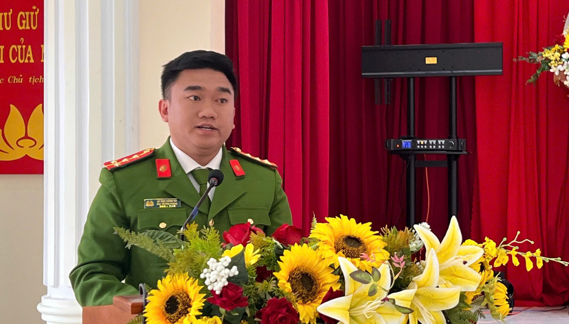 | Trưởng Công an phường Lâm Viên - Đà Lạt, Đại úy Lê Ngô Hồng Vũ phát biểu tại buổi lễ phát động |