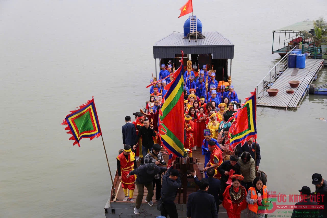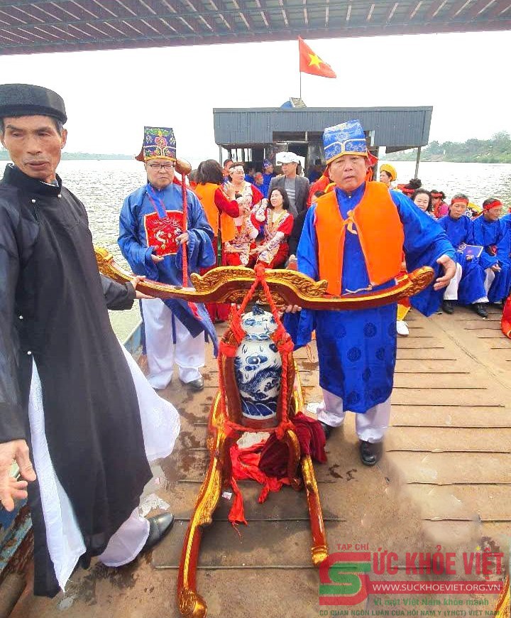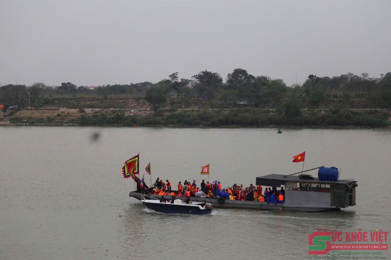 | Thuyền đưa đoàn rước nước ra giữa dòng sông Hồng chuẩn bị múc nước bằng một gáo đồng vào chum Ngô. |