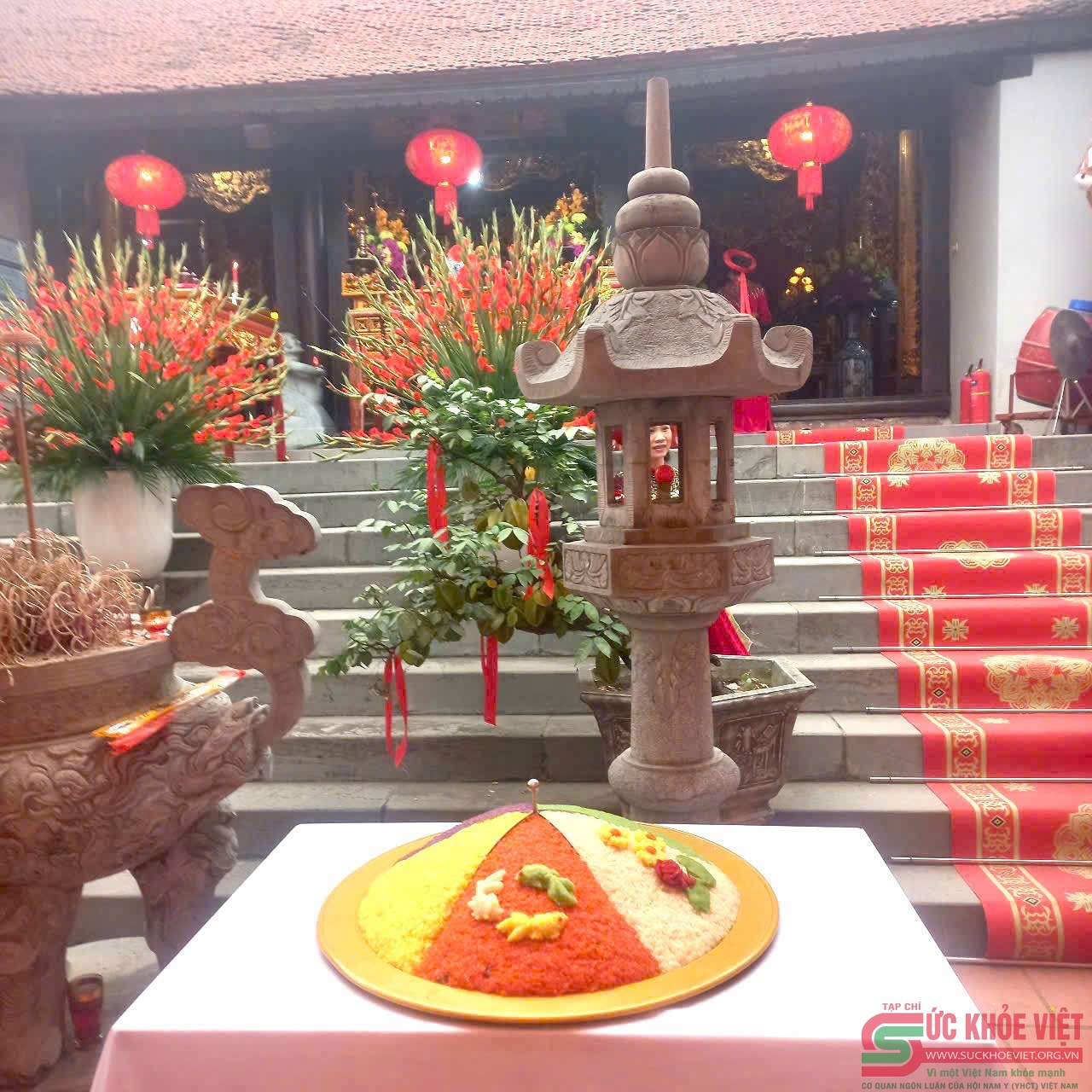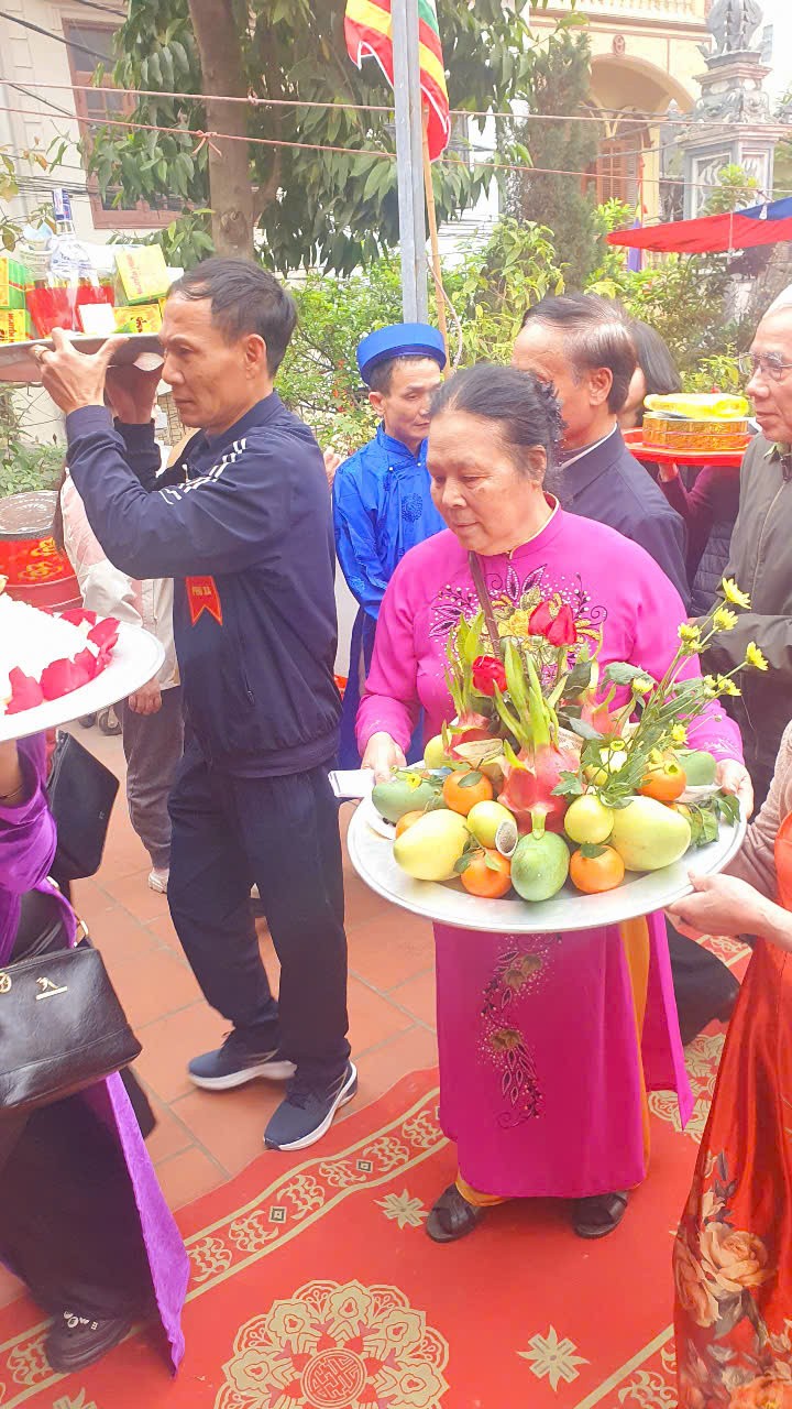 | Người dân làng dâng cỗ chay như bánh trôi, bánh chay và cỗ mặn như xôi, gà, lợn quay. |