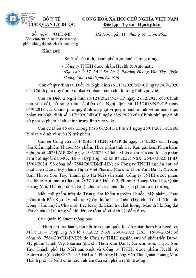 1. Đình chỉ lưu hành, thu hồi trên toàn quốc lô sản phẩm kem bôi ngoài da Mộc Bì – Tuýp 13g (Số lô: 07.2022; NSX: 26/04/2022; HSD: 15/04/2024; Số công bố: 7584/20/CBMP-HN; do Công ty TNHH nghiên cứu và phát triển Dược, Mỹ phẩm Thịnh Việt Pharma (địa chỉ Thôn Kim Đái 1, Xã Kim Sơn, Thị xã Sơn Tây, Thành phố Hà Nội) sản xuất và Công ty TNHH dược phẩm Health & Automatic (địa chỉ Ô 37, Lô 5 Đề Lừ 2, Phường Hoàng Văn Thụ, Quận Hoàng Mai, Thành phố Hà Nội) chịu trách nhiệm đưa sản phẩm ra thị trường. Lý do thu hồi: Mẫu thử không đạt tiêu chuẩn chất lượng về chỉ tiêu về tổng số vi sinh vật đếm được.