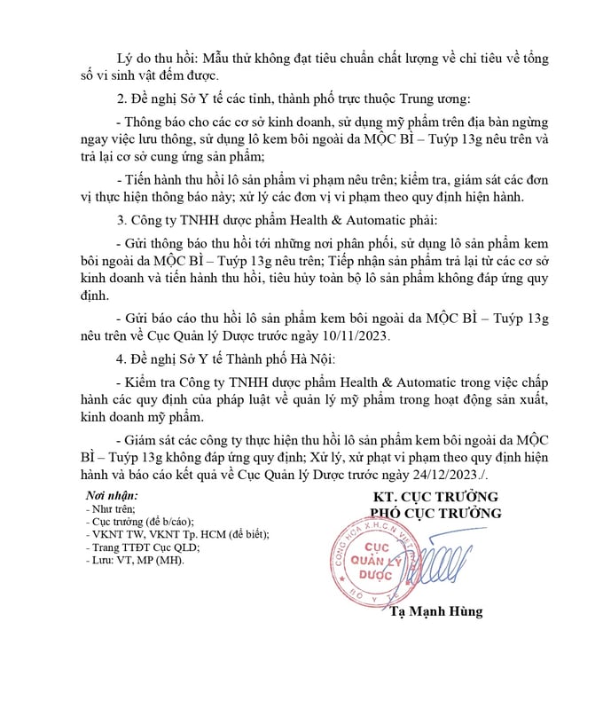 - Giám sát các công ty thực hiện thu hồi lô sản phẩm kem bôi ngoài da Mộc Bì – Tuýp 13g không đáp ứng quy định; Xử lý, xử phạt vi phạm theo quy định hiện hành và báo cáo kết quả về Cục Quản lý Dược trước ngày 24/12/2023.