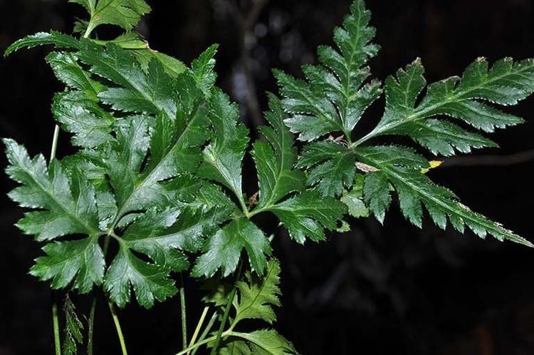 Lá của cây mọc tập trung ở gốc, có cuống dài, xẻ sâu hình chân vịt, màu xanh đậm, gân nổi rõ. Vào mùa xuân, cây trổ hoa nhỏ màu vàng nhạt, mọc thành cụm. Quả dạng nang, chứa nhiều hạt nhỏ màu đen.