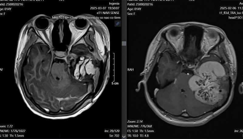 Một thiếu nữ 14 tuổi được phát hiện mắc khối u não phát triển từ nền sọ bên trái, cụ thể là từ vùng xương đá - một vị trí rất hiếm gặp. Trước đó, em đã từng trải qua hai lần phẫu thuật tại hai bệnh viện lớn ở TP HCM, tuy nhiên cả hai lần chỉ dừng lại ở bước sinh thiết, với chẩn đoán ban đầu là u máu trong xương. Sau phẫu thuật, tình trạng chảy máu tai vẫn tái diễn, khiến gia đình lo lắng và quyết định đưa em ra Hà Nội thăm khám tại Bệnh viện Hữu nghị Việt Đức vào cuối tháng 2/2025.