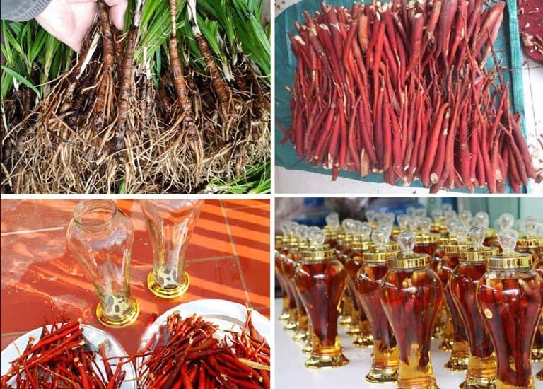 1kg rễ sâm cau tươi, 3l rượu trắng 45 độ trở lên.