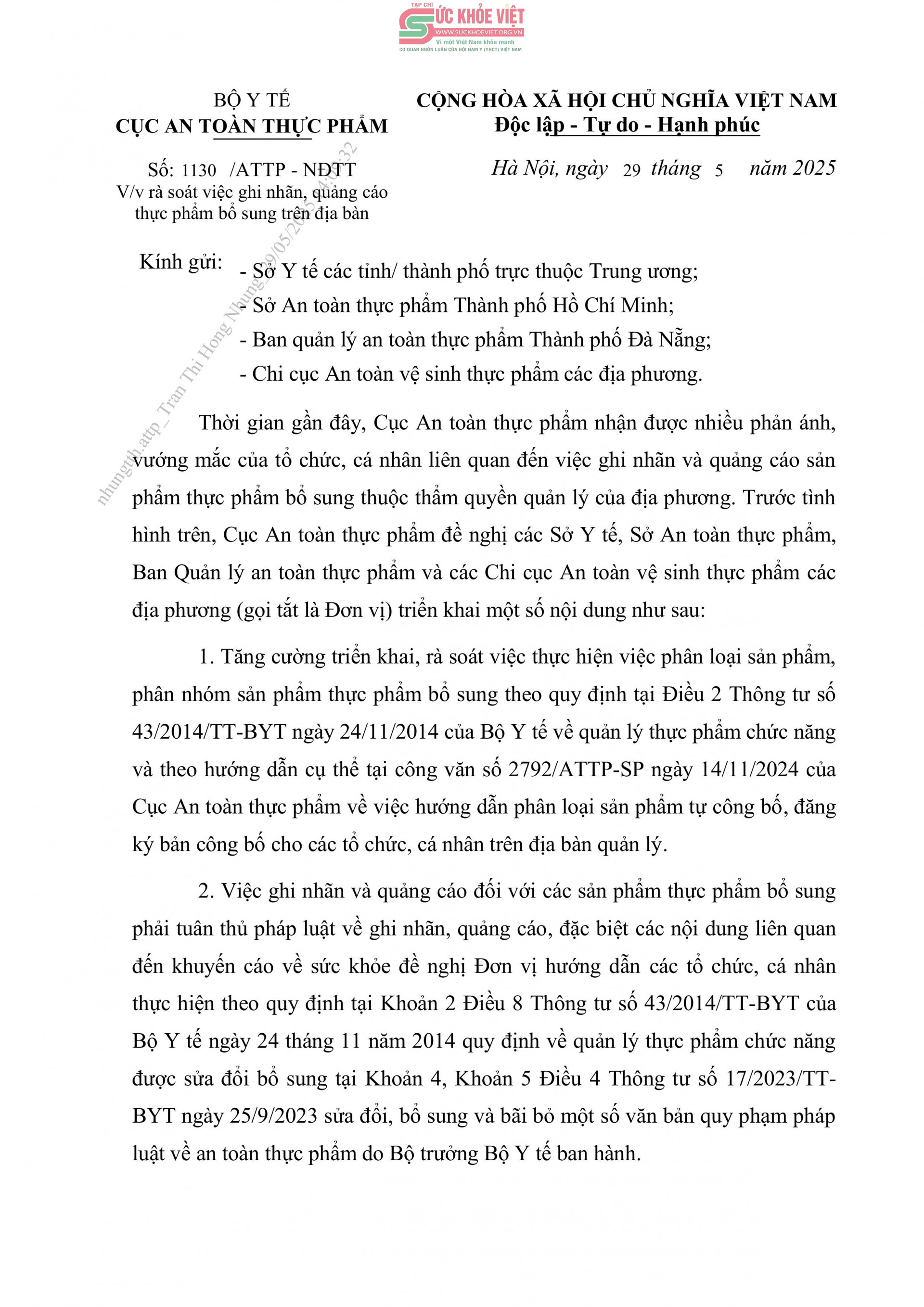 Trước thực trạng này, ngày 29/5/2025, Cục An toàn thực phẩm đã ban hành Công văn số 1130/ATTP-NĐTT gửi Sở Y tế, Sở An toàn thực phẩm, Ban Quản lý An toàn thực phẩm và các Chi cục An toàn vệ sinh thực phẩm trên toàn quốc, yêu cầu triển khai đồng bộ các biện pháp kiểm soát hoạt động ghi nhãn và quảng cáo sản phẩm thực phẩm bổ sung.