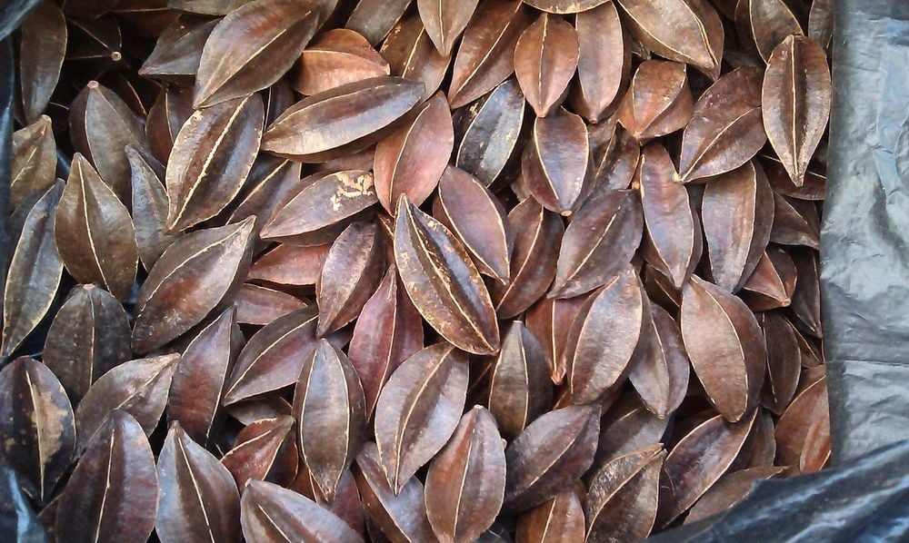 Trong quả chứa một hạt hình thoi, vỏ màu nâu sẫm, dễ bóc, phần nhân bên trong mềm có màu vàng, vị ngọt, không mùi.