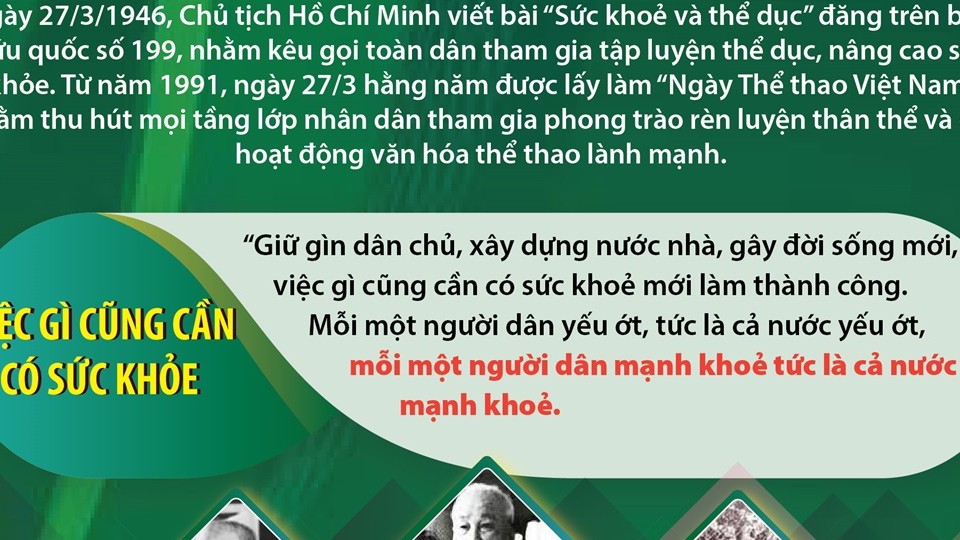 Ngày 27/3/1946, Chủ tịch Hồ Chí Minh viết bài “Sức khoẻ và thể dục” đăng trên báo Cứu quốc số 199, nhằm kêu gọi toàn dân tham gia tập luyện thể dục, nâng cao sức khỏe.