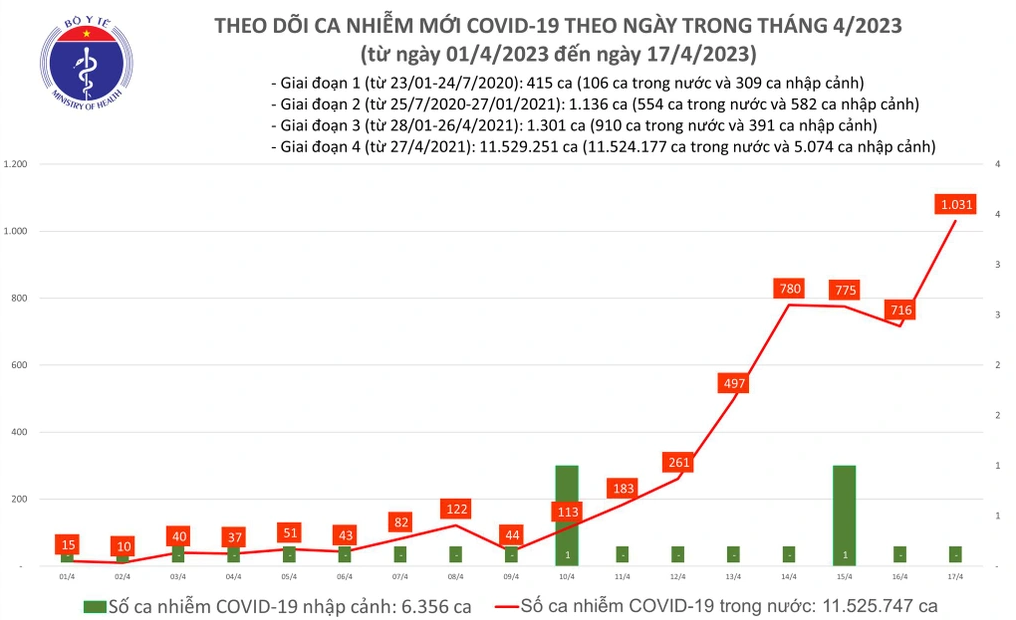 Ngày 17/4: Số mắc Covid-19 mới tiếp tục tăng vọt lên hơn 1.000 ca