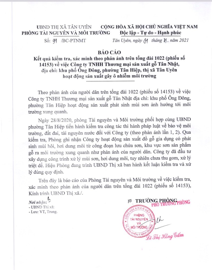 Tại Văn bản số: 91/BC-PTNMT ngày 01/04/2021 của Phòng Tài nguyên và Môi trường TX. Tân Uyên đã ghi nhận Công ty Tân Nhật “có phát sinh mùi hôi, hơi dung môi từ công đoạn lưu chứa sơn, khu vực sơn sản phẩm gỗ ra môi trường xung quanh đúng như phản ánh của người dân…”. Văn bản này do bà Nguyễn Thị Hồng Gấm – Phó trưởng phòng Tài nguyên và Môi trường TX. Tâm Uyên ký…