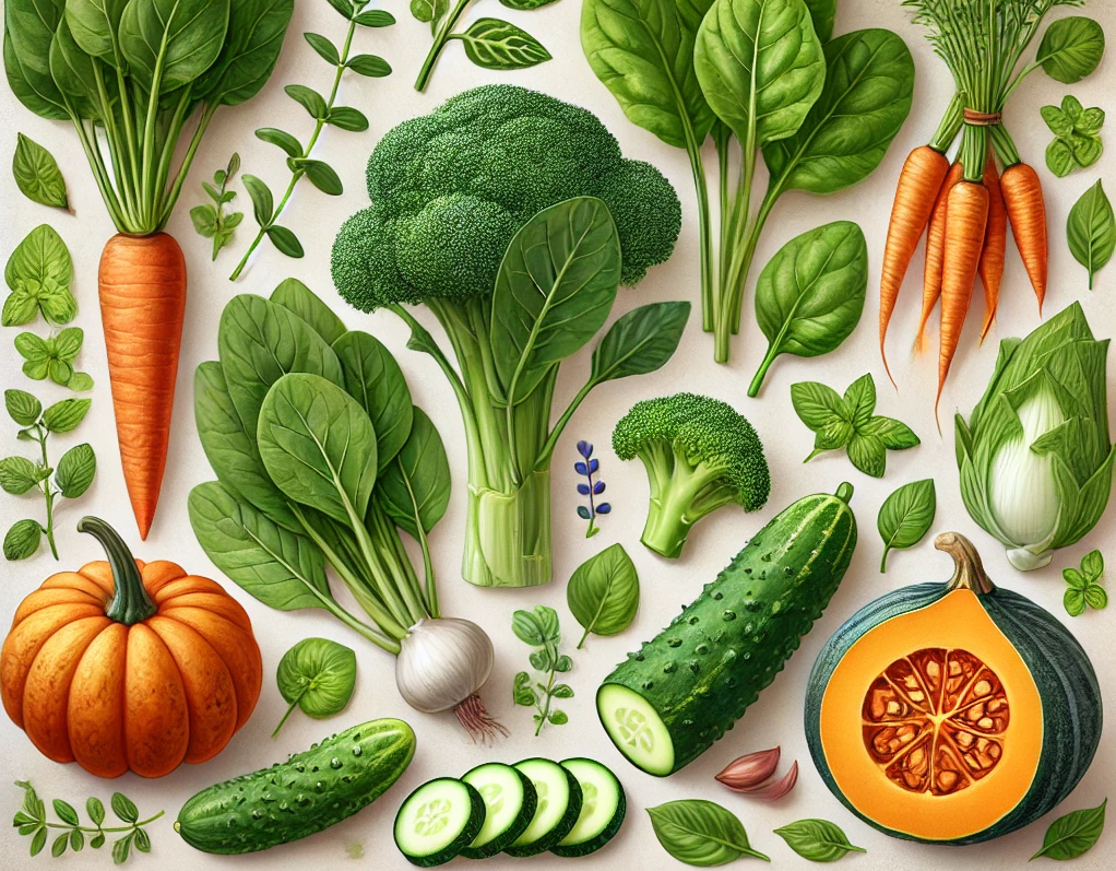 Rau xanh: Cải bẹ xanh, bí đỏ, dưa chuột