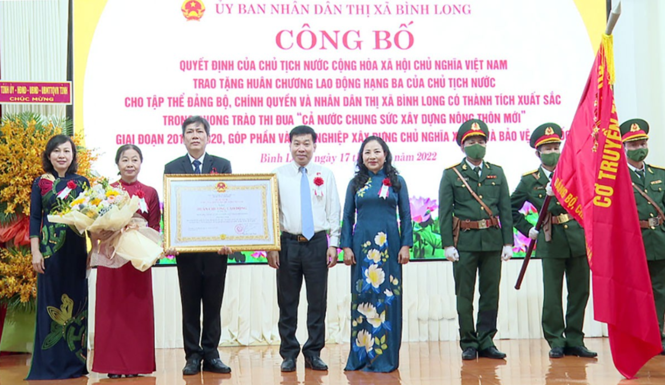 | Thị xã Bình Long long trọng đón nhận Huân chương Lao động hạng Ba của Chủ tịch nước do có thành tích xuất sắc trong phong trào thi đua “Cả nước chung sức xây dựng nông thôn mới” giai đoạn 2016 - 2020 |