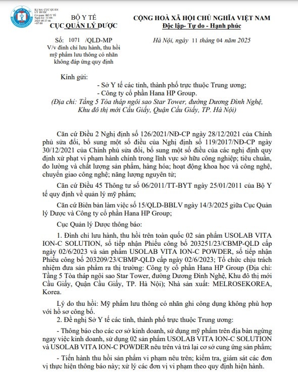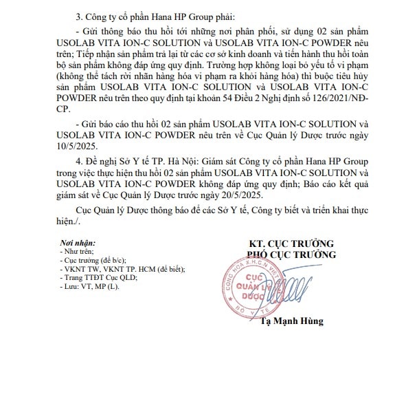 Bên cạnh đó, Công ty cổ phần Hana HP Group gửi báo cáo thu hồi 02 sản phẩm USOLAB VITA ION-C SOLUTION và USOLAB VITA ION-C POWDER nêu trên về Cục Quản lý Dược trước ngày 10.5.2025.