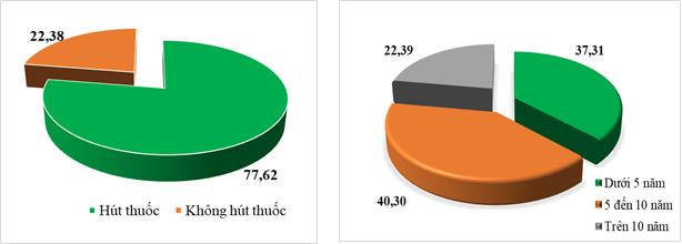 Kết quả cho thấy, 326/420 người (77,62%) có hút thuốc, cao gấp ba lần so với người không hút (22,38%). Trong số này, người hút dưới 5 năm chiếm 37,31%, từ 5–10 năm là 40,30% và trên 10 năm là 22,39%.