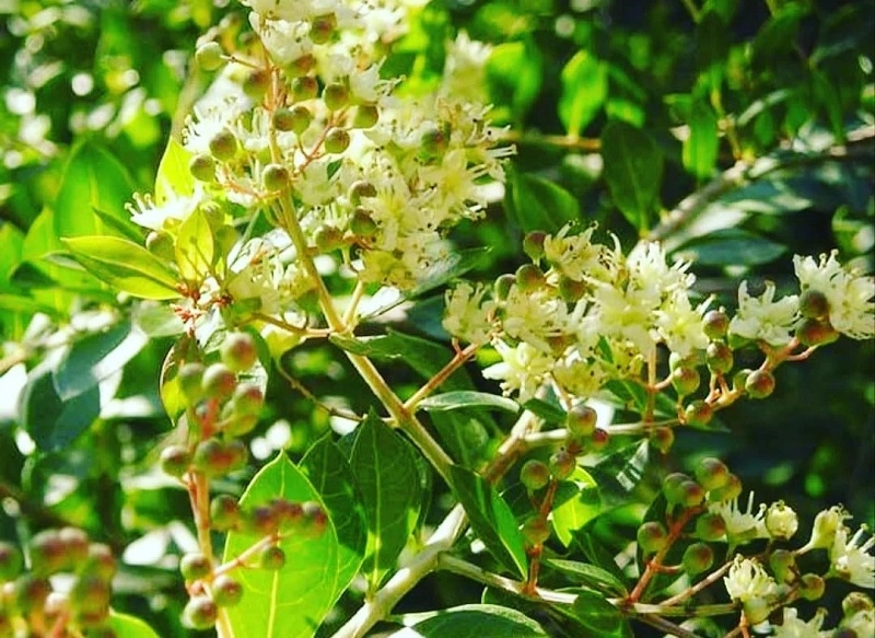 Hoa cây mọc dạng chùm, hình thùy và mọc ở đầu cành. Hoa mới nở có màu trắng và chuyển thành màu đỏ, vàng sậm khi về già; mùi hoa thơm hăng hắc;