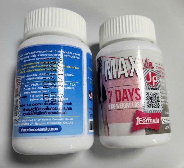 Lọ thuốc giảm cân của bệnh nhân sử dụng có chữ tiếng nước ngoài, không có nhãn phụ tiếng Việt. Trên lọ thuốc có nội dung "7 ngày giảm 7kg" bằng Tiếng Anh.
