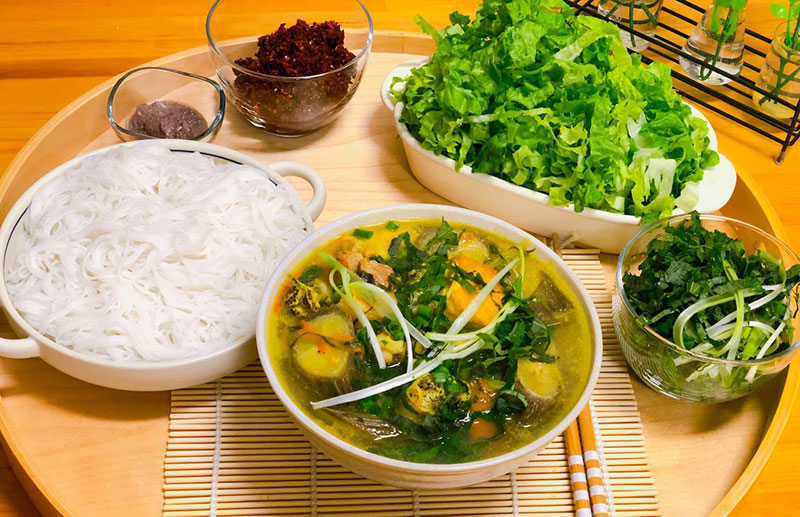 Nước dùng được nấu từ xương cá, có vị chua dịu của me, cà chua và thơm nồng của sả, ớt.