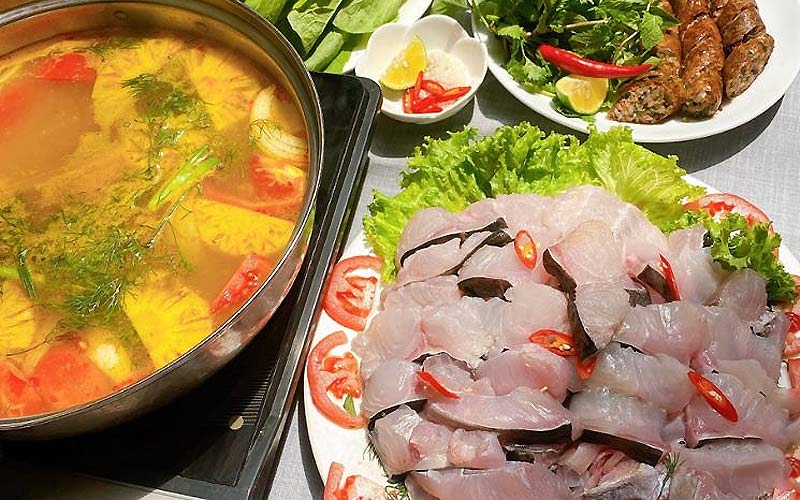 Khi ăn, nhúng từng lát cá vào nồi lẩu sôi, thưởng thức cùng rau muống, bắp chuối, giá đỗ.