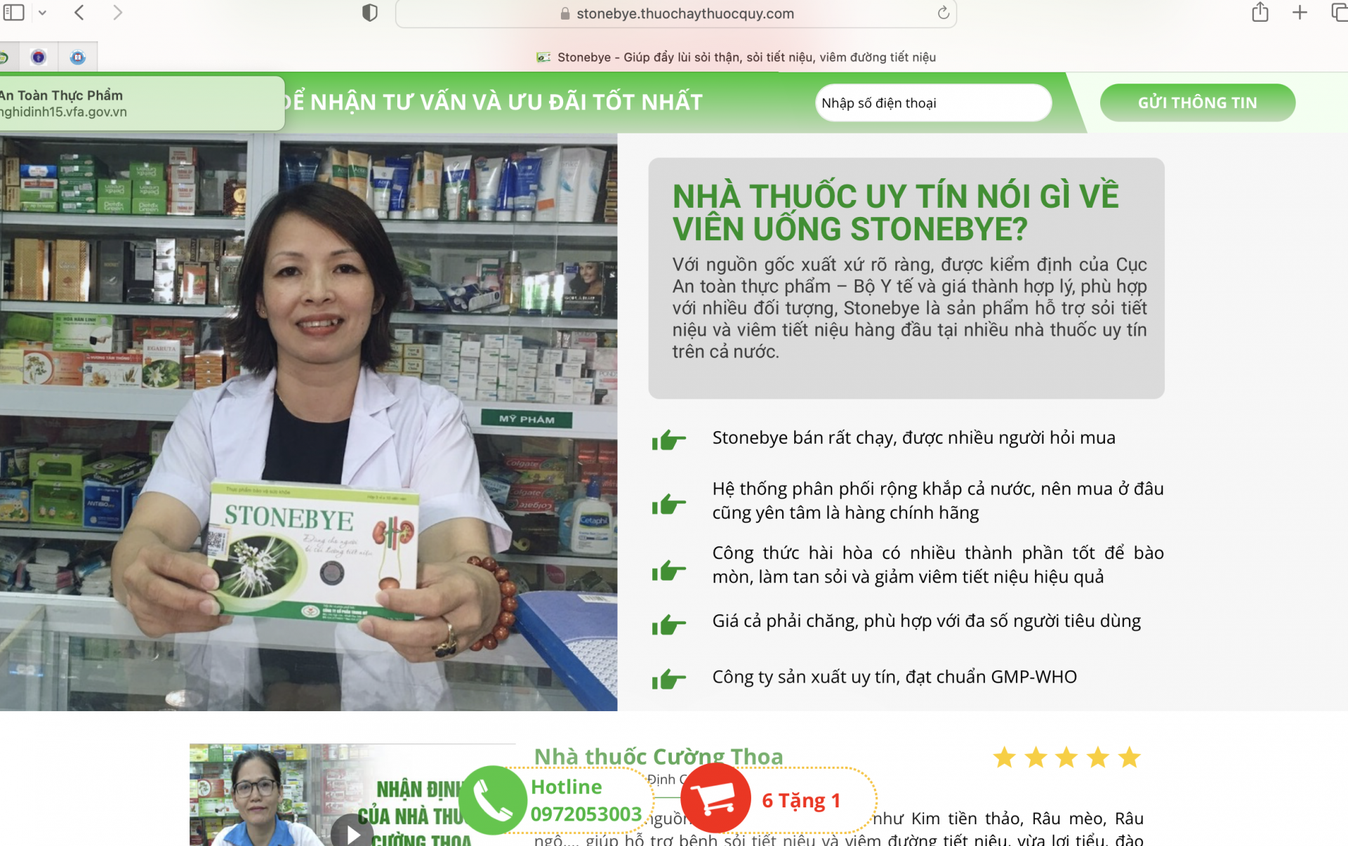 Theo phản ánh của người tiêu dùng, trên một số website, nền tảng internet xuất hiện nhiều thông tin quảng cáo về sản phẩm TPBVSK Stonebye với những lời “có cánh” khiến người tiêu dùng hiểu nhầm là thuốc. Cụ thể, trên các website như: https://stonebye.thuochaythuocquy.com, https://chuabenhtietnieu.com , http://stonebye.duoclieuquy.co có khẳng định: “Stonebye lựa chọn số 1 cho người bệnh sỏi thận, sỏi tiết niệu, viêm đường tiết niệu. Giải pháp toàn diện đánh tan sỏi thận, ngừa viêm tiết niệu”, Thực phẩm bảo vệ sức khỏe Stonebye là sản phẩm duy nhất tại Việt Nam được nghiên cứu và bào chế kết hợp tinh chất của 7 thành phần thảo dược tiêu biểu gồm: Kim tiền thảo, Râu mèo, Râu ngô, Xa tiền tử, Bán biên liên, Hoàng bá, Nhọ nồi mang lại tác động toàn diện giúp đẩy lùi mọi loại sỏi thận, sỏi tiết niệu và ngừa viêm rất công hiệu”.