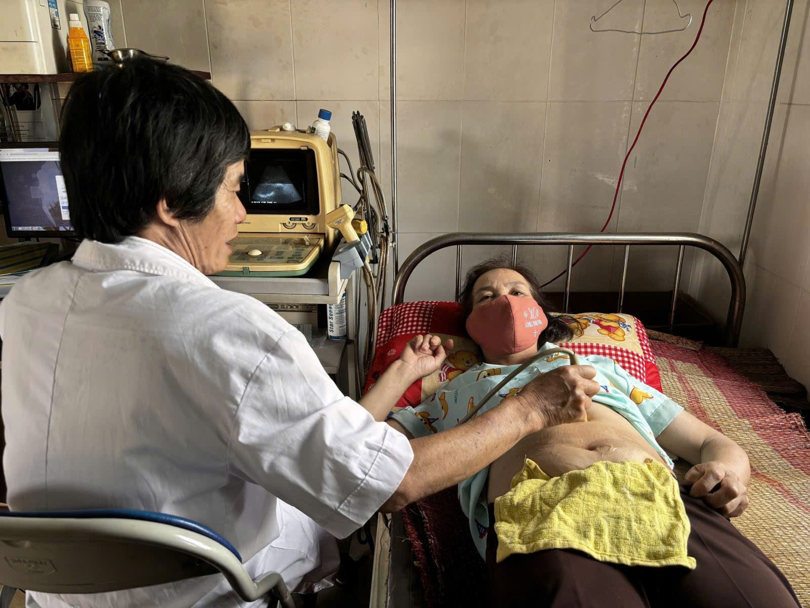 | Bác sĩ Ngô Gia Quyết - Trưởng Trạm Y tế xã Krong Búk siêu âm chẩn đoán bệnh cho người dân tới khám tại Trạm. |