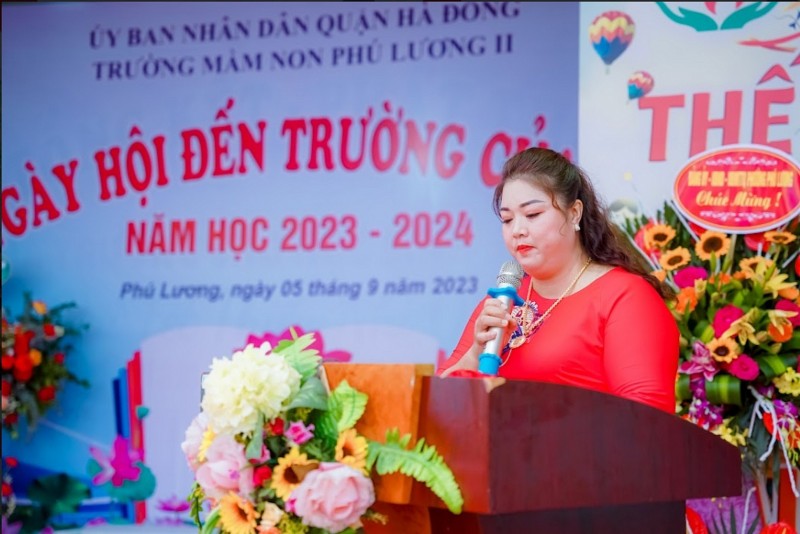 Phát biểu trong buổi lễ, Thạc sỹ Giáo dục Đào Thị Nhàn, Bí thư chi bộ, Hiệu trưởng Trường Mầm Non Phú Lương II, đã gửi lời chào mừng và lòng biết ơn sâu sắc tới tất cả các vị đại biểu đã đến tham dự chia sẻ khích lệ các thầy cô, trò trong ngày đầu tiên của năm học mới. Cô cũng nhấn mạnh, với tinh thần “yêu nghề, mến trẻ”, hết lòng vì các con, học sinh thân yêu, khẳng định rằng 50 cán bộ, giáo viên và nhân viên của trường đều là những người có năng lực, đam mê và sáng tạo, đã đồng lòng xây dựng một môi trường giáo dục vững chắc bước qua từng ngày.