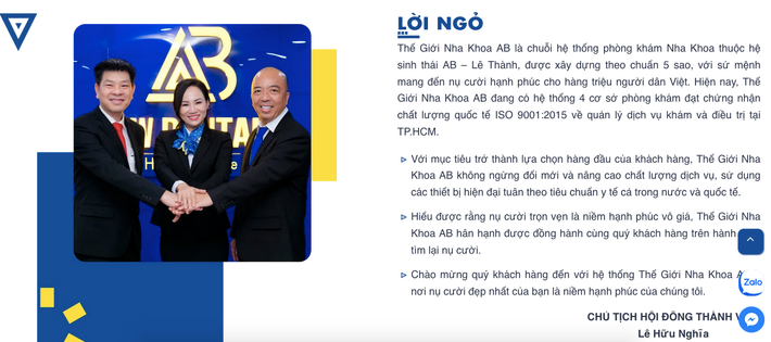 Mặc dù hàng loạt cơ sở thuộc Hệ thống Thế giới Nha khoa AB bị xử phạt, thậm chí bị tước giấy phép vì vi phạm nhưng trên website chính thức của Thế giới Nha khoa AB https://thegioinhakhoaab.vn/ vẫn quảng cáo một cách mạnh mẽ về sự uy tín, chất lượng dịch vụ và đội ngũ bác sĩ chuyên môn cao. Liệu sự chênh lệch giữa lời nói và việc làm này có để lại những dấu hỏi lớn cho khách hàng? Liệu rằng người tiêu dùng sẽ tiếp tục đặt niềm tin vào một thương hiệu đã bị chỉ trích vì sự thiếu sót trong quy trình pháp lý?